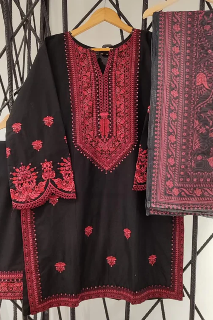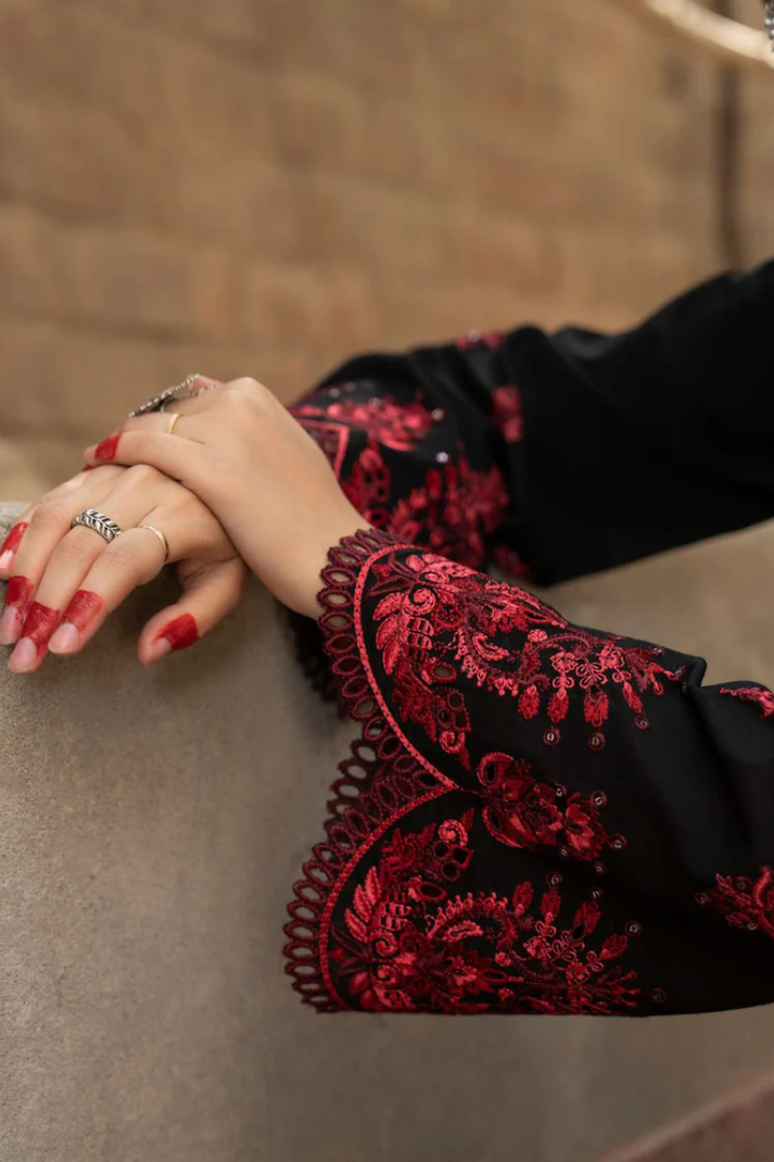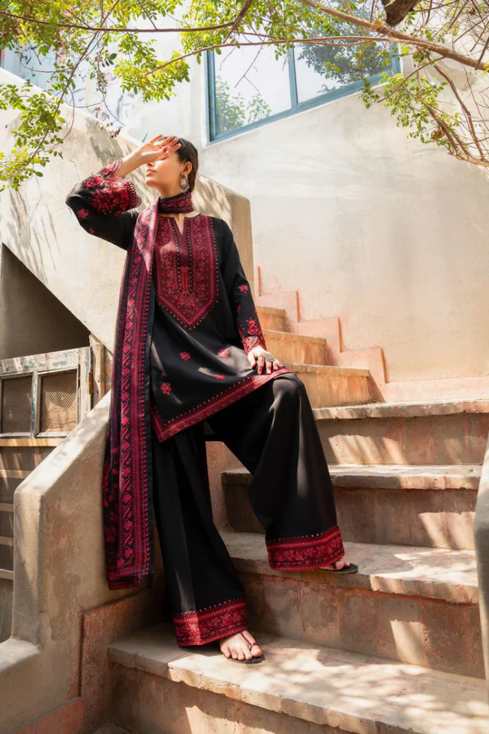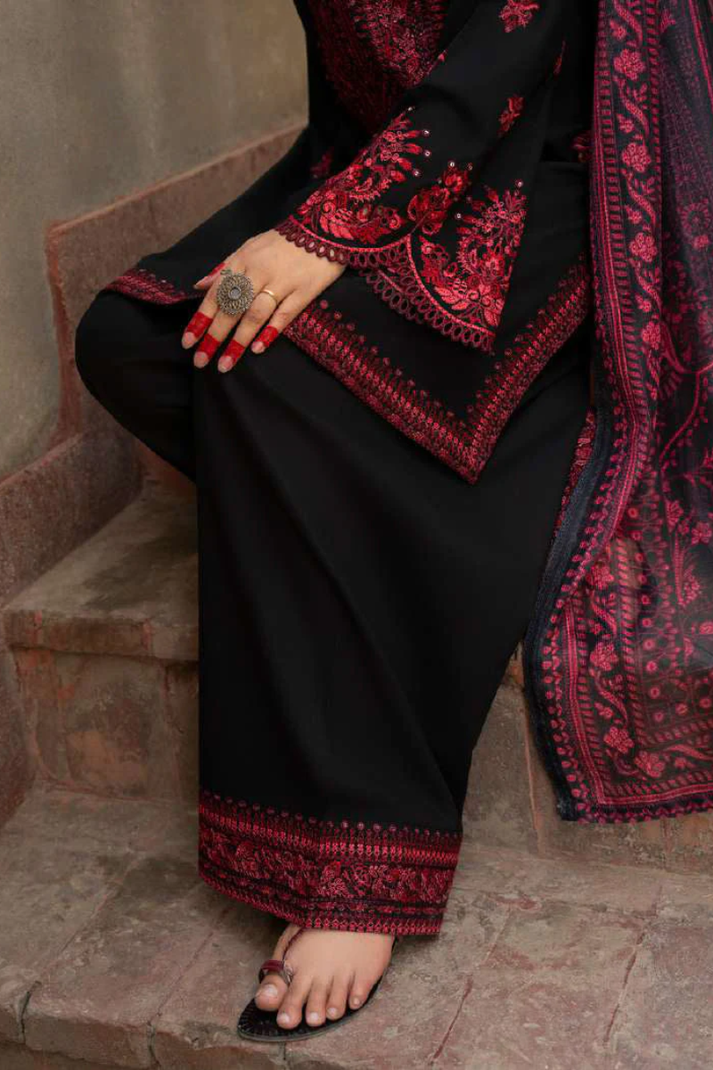 Crafted from Premium Marina Fabric, this outfit guarantees both essential warmth and maximum comfort, infused with timeless elegance. The deep Black suit is exquisitely adorned with intricate Scarlet Red Embroidery, creating a truly luxurious statement look.