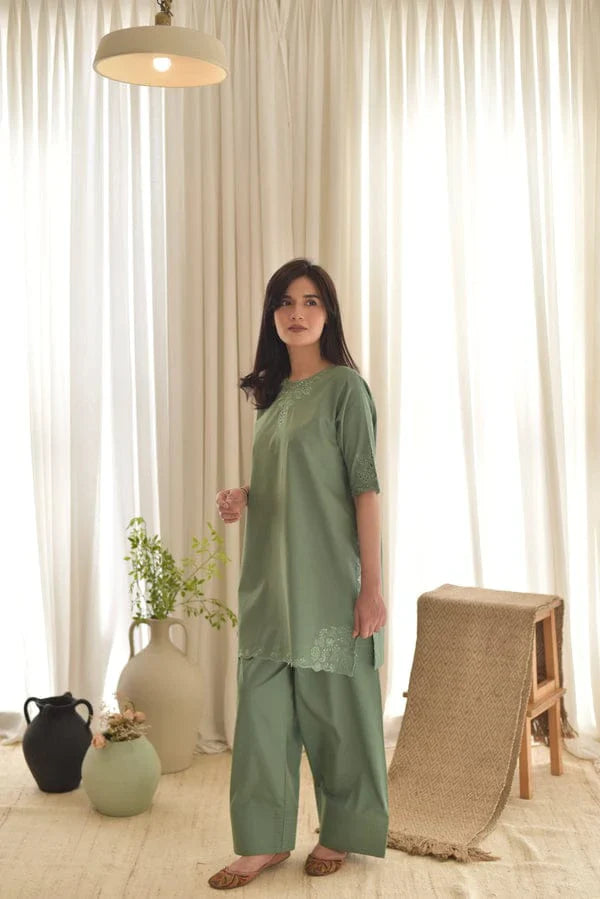 Sabz Sitara is a refreshing 3-piece suit that exudes calm elegance and timeless charm. This ensemble features a soft sage green shirt with delicate embroidery on the neckline, sleeves, and hemline, paired with matching wide-leg trousers for a relaxed yet graceful silhouette. The look is completed with a lightweight dupatta in the same soothing tone, enhancing the outfit's airy and elegant appeal. Perfect for daytime gatherings, casual outings, or winter festivities, Sabz Sitara blends comfort with sophistication effortlessly.